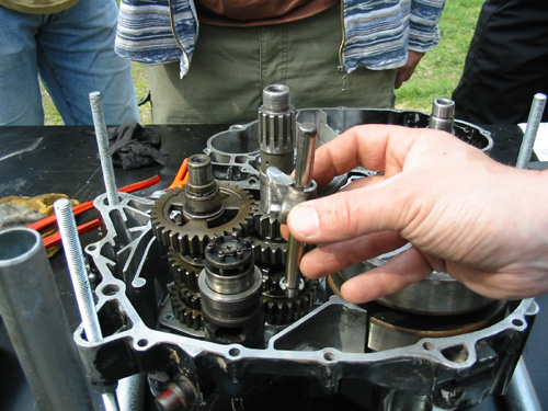 Die lange Welle mit nur einer Schaltgabel kommt nach vorne (in Fahrtrichtung).