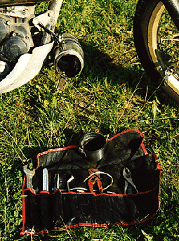 Damit es nicht klappert, scheuert und klötert, ist mein Werkzeug nun in einer Werkzeugrolltasche. Wenn ich mich auf die XT setze brauche ich mir seit dem keine Gedanken mehr zu machen. Montierhebel, Schraubenschlüssel, Kerzenschlüssel, etc. sind immer am Bock und Diebstahlsicher untergbracht.