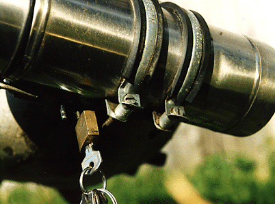 Das Gewinde meines Deckels funktioniert (nach langem Gefeile) wieder, leider ist es nicht wasserdicht. Zum Verschließen der Flasche und auch Abschließen, habe ich an der Unterseite einen Kistenverschluß angebracht, durch diesen kommt ein kleines Vorhängeschloß.